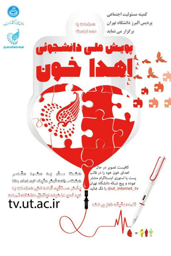 کمیته مسئولیت اجتماعی پردیس البرز دانشگاه تهران در پی کاهش ذخاير استراتژيک خون و فراورده هاي خوني، برنامه ای تحت عنوان پویش ملی اهدا خون دانشجویی با همکاری شبکه اینترنتی دانشگه تهران برگزار می کند.
