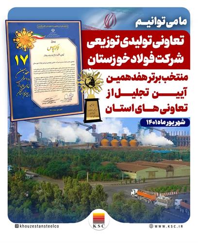 به گزارش روابط عمومی در هفدهمین آیین تجلیل از تعاونی های برتر استان خوزستان که با حضور جمعی از مدیران و مسئولین استانی و جمعی از اتحادیه های تعاونی و تعاونگران در محل سالن اداره کل تعاون،کار و امور اجتماعی استان برگزار شد شرکت فولاد خوزستان به عنوان تعاونی برتر انتخاب گردید و از فعالیت های چشمگیر تعاونی تقدیر بعمل آورده شد.