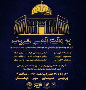 به گزارش تابناک رضوی، طی برنامهای که به وقت قدس شریف نام دارد، از یکشنبه ۲۷ فروردین به مدت ۳ روز، فیلمهای «فرحه» به کارگردانی دارین سلام، «اسلو» به کارگردانی بارتلت شر و «کفرناحوم» به کارگردانی نادین لبکی در پردیس سینمایی مهر کوهسنگی مشهد برگزار خواهد شد.