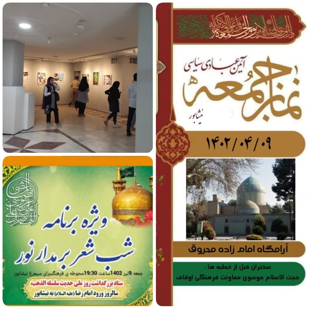 گشایش نمایشگاه عکس « شوق دیدار» مجموعه منتخب هنرمندان عکاس نیشابوری به مناسبت سالروز ورود حضرت امام رضا (علیهالسلام) به نیشابور ساعت ۹ صبح در محل نگارخانه کمال الملک اداره فرهنگ و ارشاد اسلامی نیشابور.