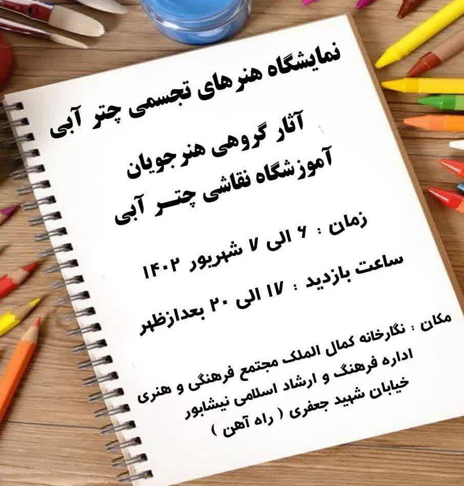مسئول امور هنری اداره فرهنگ وارشاد اسلامی نیشابور تصریح کرد:نمایشگاه گروهی هنرهای تجسمی چترآبی نگارخانه کمال الملک مجتمع فرهنگی وهنری اداره فرهنگ وارشاد اسلامی نیشابور واقع در خیابان شهید جعفری(راه آهن) برپا می باشد.