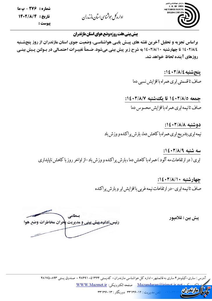شرایط جوی امروز مازندران براساس تجزیه و تحلیل آخرین نقشه های پیـش یابـی هواشناسـی، نیمه ابری به ویژه در دامنه ها و ارتفاعات ابری با رگبار و رعد و برق پراکنده، وزش باد و کاهش دما و از شب بتدریج با کاهش ناپایداری و در روز پنج‌شنبه نیز صاف تا نیمه ابری همراه با افزایش نسبی دما پیش‌بینی شده است.