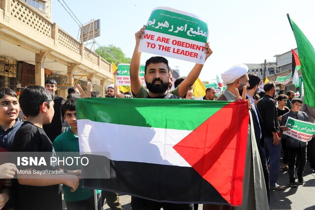 تابناک خوزستان: مردم اهواز امروز جمعه علی رغم گرمای طاقت فرسای اهواز بعد از نماز جمعه، بار دیگر در حمایت از مردم غزه، انزجار خود را از رژیم غاصب صهیونیستی فریاد زدند و شعار مرگ بر اسرائیل سر دادند.