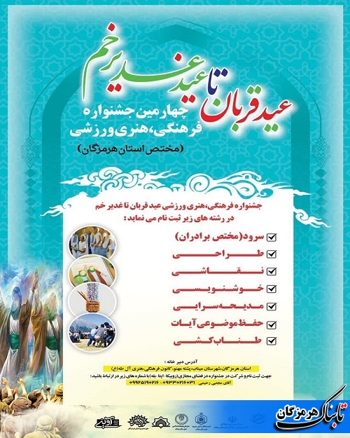 سرود(ویژه برادران)، طناب کشی(زیر ۲۰ سال)، نقاشی(زیر ۱۵ سال)، طراحی(زیر ۱۸ سال)، خوشنویسی(زیر ۱۸ سال)، حفظ آیات موضوعی(زیر ۱۸ سال) و مدیحه سرایی(زیر ۱۸ سال) از رشته های چهارمین جشنواره فرهنگی، هنری و ورزشی «عید قربان تا غدیر خم» است.