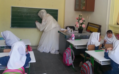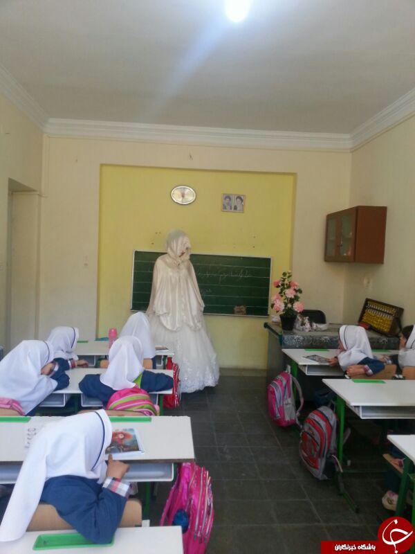 تابناک کهگیلویه و بویراحمد / فرهنگی ، همزمان با جشن آغاز بهار مهر و سال تحصیلی جدید معلم همدانی با لباس عروس در کلاس درس حاضر شده و به تدریس پرداخت.