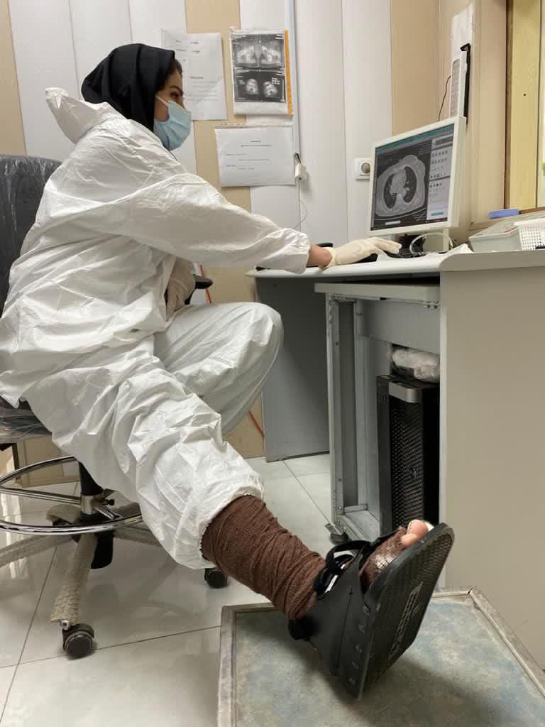 اما یکی از اعضای کادر درمان که علیرغم اینکه پای خود را در گچ دارد و در بخش سی تی اسکن و رادیولوژی بیمارستان رازی مشغول خدمات رسانی به بیماران حاد کرونایی است، خانم ندا رضایی می باشد و با شرایط سختی که به لحاظ جسمانی دارد اما سنگر خدمات رسانی به بیماران را رها نکرده و شگفتی دیگری از نحوه خدمات رسانی به بیماران را به معرض نمایش می گذارد.